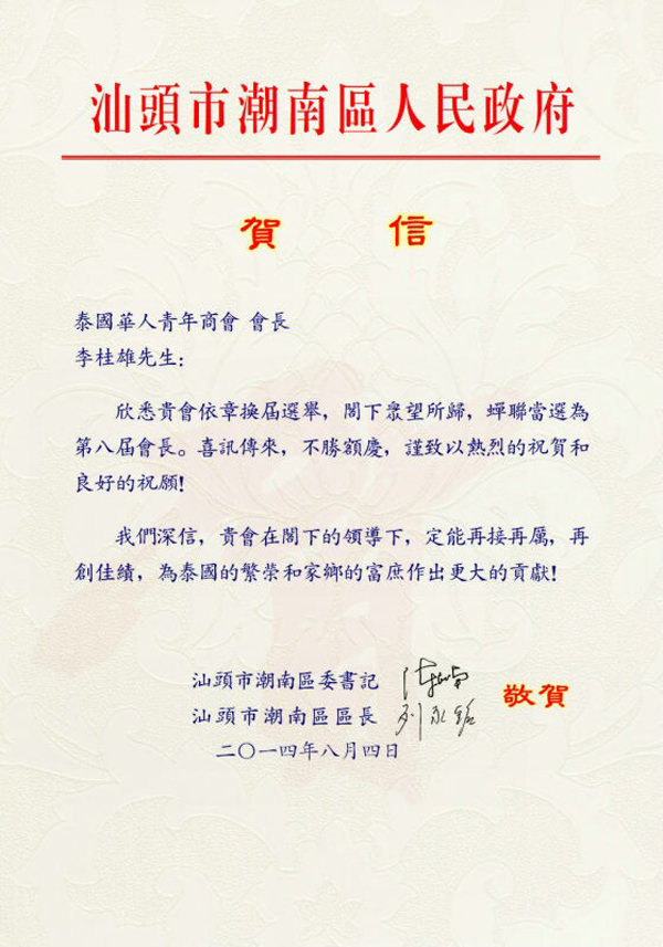 潮南区委区政府贺李桂雄蝉联青商会第八届会长