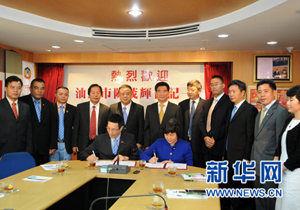 汕头经贸联络处在泰国成立。图为汕头市政府代表与泰国华人青年商会代表共同签署《合作设立汕头驻泰国经贸联络处协议书》。新华网记者 毕尚宏 摄