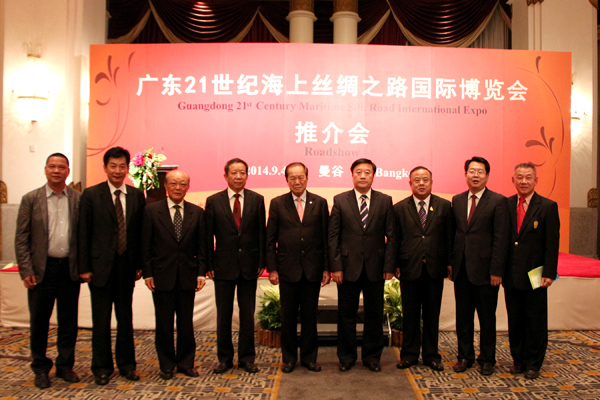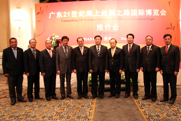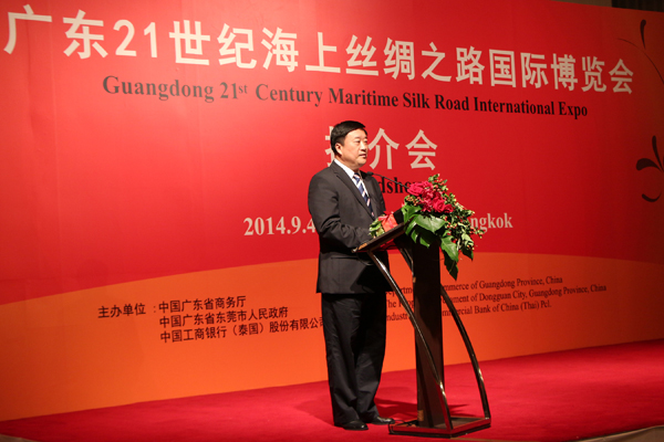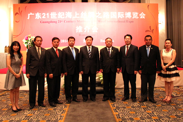 2014年9月4日晚,广东21世纪海上丝绸之路博览会泰国推介会,假曼谷无线电话路芭莎亿提呢大酒店二楼举行。由广东省商务厅、广东东莞市人民政府、中国工商银行(泰国股份有限公司)等联合举办。广东省商务厅副厅长吴军、泰国中华总商会主席刘锦庭、中国工商银行(泰国)有限公司董事长胡晔等在推介会上讲话,介绍广东21世纪海上丝绸之路国际博览会将于2014年10月31日──11月2日在东莞市广东现代国际展览中心举行,诚邀泰国工商企业界人士参加“海博会”展览。泰国华人青年商会会长李桂雄、副会长张创标、钟和武、黄懿光、陈平;主任许俊龙、王易;总干事黄成等出席了推介会,并大力支持、宣传、配合参加10月31日─11月2日在东莞市举办的“海博会”。