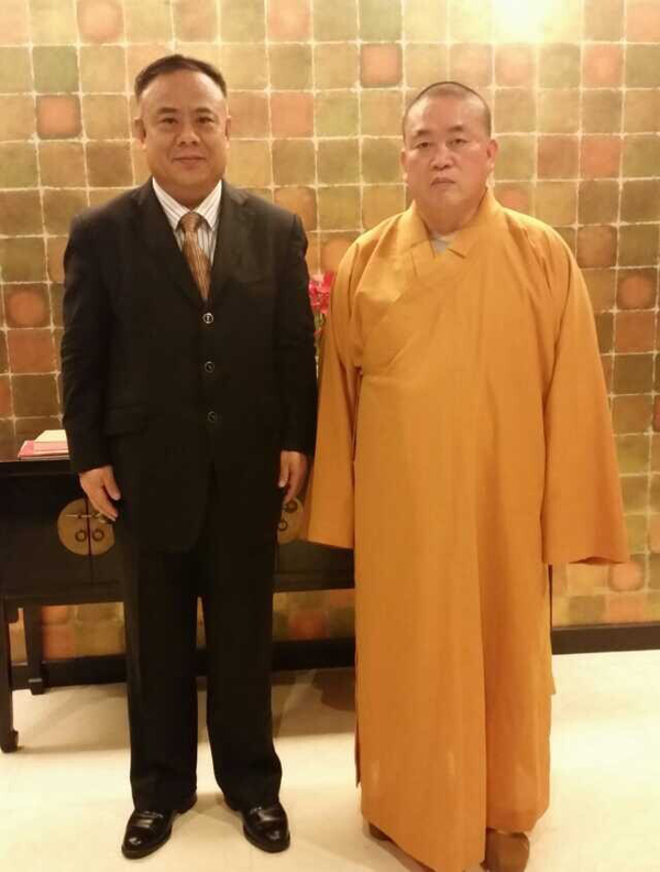 中国嵩山少林释永信方丈率团于2014年12月18日抵泰国访问,受到泰国华人青年商会会长李桂雄等热烈欢迎。图为李桂雄会长与释永信方丈合影。