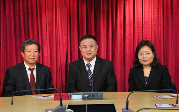高文宽参赞(左)、张佩东参赞(右)、与李桂雄会长(中)在座谈会上亲切交谈。