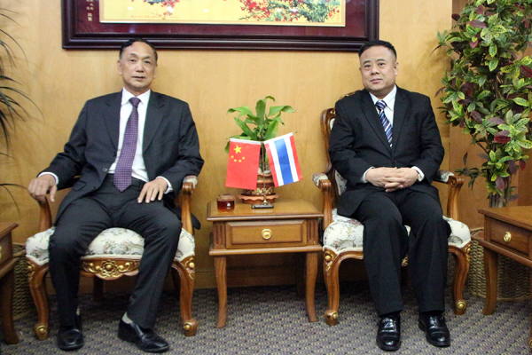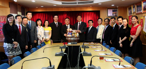 2014年12月25日,泰国广西总商会李宇明主席、林茂强执行主席偕同该会副主席刘汉政、莫锦策、陈良军、梁聪、罗邦宇以及主任韦伟欣、贾银钰、李珂珂、葛新荣、苏艳红,总干事韦善勇,办公室副主任谭雪义,一行前来泰国华人青年商会贺年并赠送新年礼物,受到李桂雄会长、邝锦荣副会长、陈平副会长、许少玉会长助理,时磊秘书长、黄成总干事等的热烈欢迎和亲切接待。宾主互相祝贺新年快乐、事业进步,家庭幸福,万事如意!