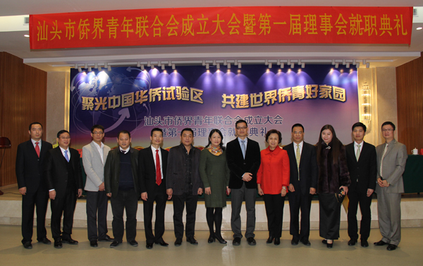 (左至右)吴海波、肖慈宣、蔡驰宇、郑升标、周德锋、林启扬、谢蕙蓉、戴文威、马逸丽、李鸿钊、郑绮玟、周史勇、林育峰等在汕头侨界联合会第一届理事会就职典礼上合影。
