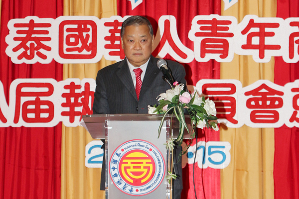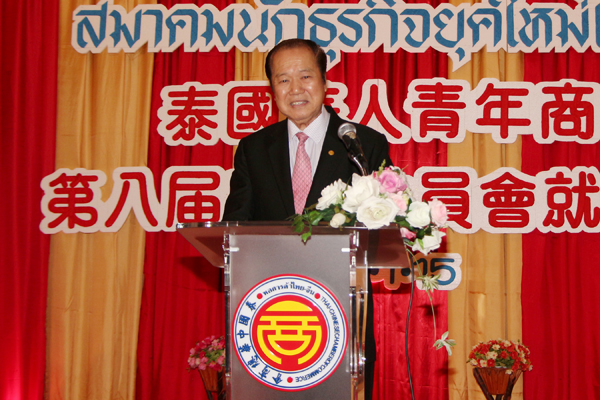 尊敬的曼谷市市长素坤攀•毋哩博亲王阁下、尊敬的中华人民共和国驻泰王国特命全权大使宁赋魁阁下、尊敬的泰国华人青年商会李桂雄会长暨各位执委,各位贵宾,女士们、先生们:大家好!今天,泰国华人青年商会在这里隆重举行第八届执委会就职典礼。首先,我谨代表泰国中华总商会,向李桂雄会长及泰国华人青年商会新届全体执委,表示热烈的祝贺并致以良好的祝愿!