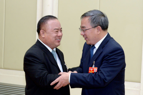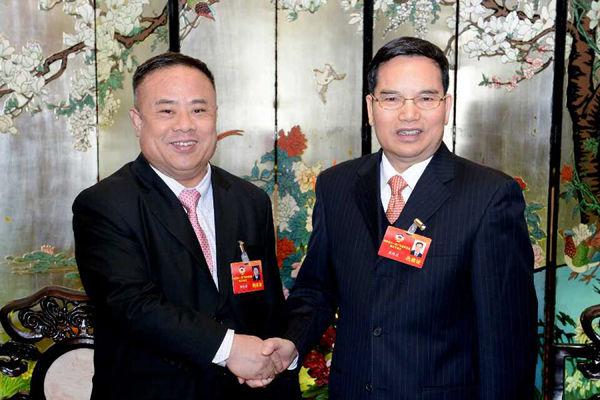 中共广东省省委书记胡春华与李桂雄会长在政协会议上亲切握手。
