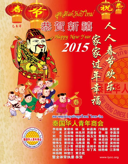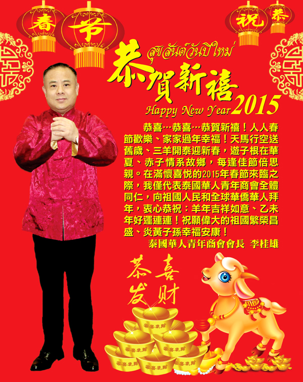 泰国华人青年商会会长李桂雄代表泰国华人青年商会全体同仁向祖国人民和全球华侨华人拜年!衷心恭祝:羊年吉祥如意,乙未年好运连连!祝愿伟大的祖国繁荣昌盛,炎黄子孙幸福安康!