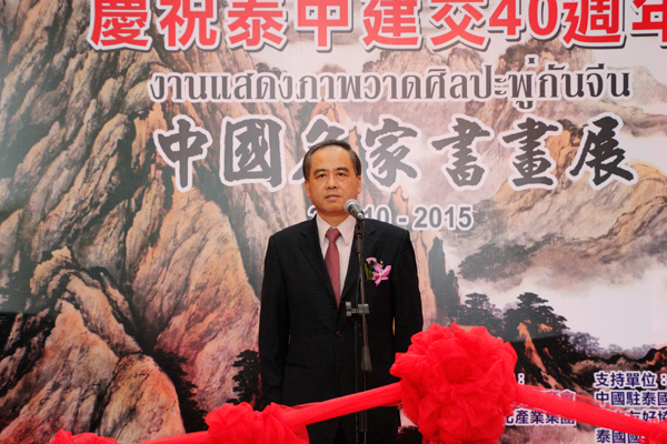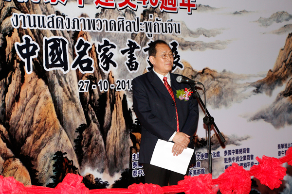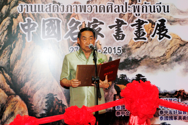 恭请泰中工商业联合总会会长切塔·塔那乍罗上将致词,他表示,非常高兴和荣幸应邀出席此次画展的开幕剪彩仪式。中国书画艺术举世闻名,泰国人民十分喜爱中国书画作品,本次书画展将通过艺术交流进一步增进泰中友好,意义重大深远,衷心祝愿“庆祝泰中建交四十周年中国名家书画展”圆满成功。