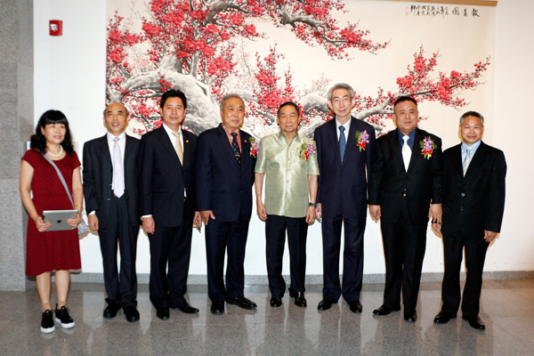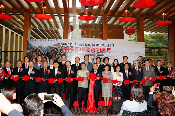 在泰中两国国歌声中,拉开“庆祝泰中建交四十周年中国名家书画展”剪彩帷幕。