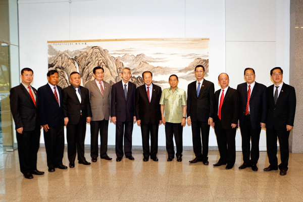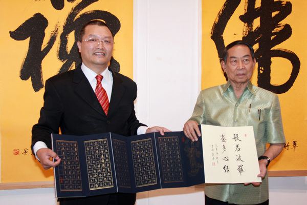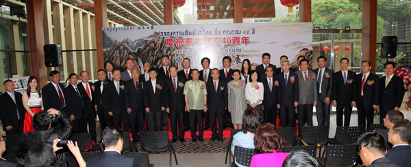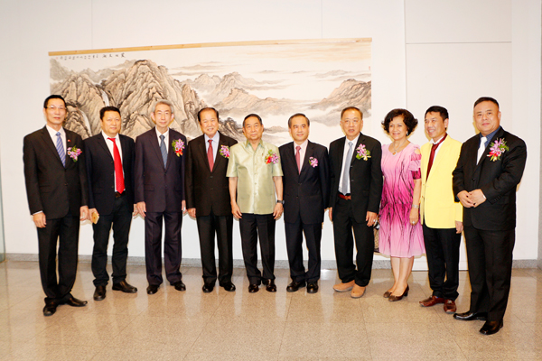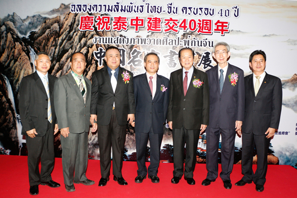 由曼谷中国文化中心、泰国华人青年商会、泰中文化产业集团主办的“庆祝泰中建交四十周年中国名家书画展”剪彩典礼择吉十月二十七日下午三时,在曼谷中国文化中心隆重举行,恭请泰中工商业联合总会会长、国务院前副总理、国防部前部长切塔·塔那乍罗上将,中国驻泰大使馆文化参赞陈疆,泰国中华总商会主席刘锦庭,泰国国家美术馆馆长亚查拉,曼谷中国文化中心顾问泰裕森、主任蓝素红,泰国最高法院资深大法官黄其国,泰国中国和平统一促进总会会长王志民,驻泰中资企业商会会长张雷,泰华进出口商会理事长郑岳龙,泰中艺术家联合会会长蔡义批,泰国华人青年商会会长李桂雄,新华通讯社曼谷分社社长明大军,泰国工商总会副主席林伟,泰中文化产业集团总裁邝锦荣,中国名家书画展代表、世界华人美术家协会理事长朱海成联合剪彩。各界嘉宾近二百人出席,场面热烈、亲切欢愉。谱写了两国友好、文化艺术交流新篇章。