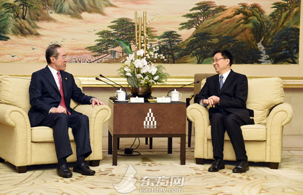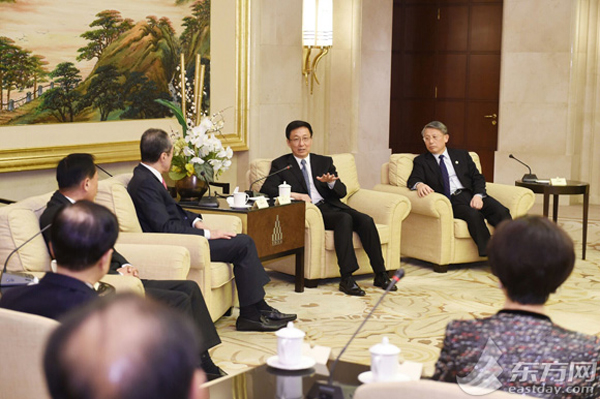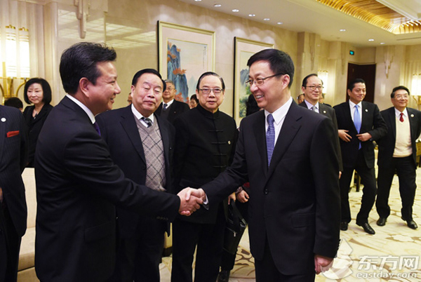 韩正说,上海海外联谊会成立30年以来,高举爱国主义主义旗帜,团结广大港澳台同胞和海外侨胞,加强联系、增进友谊、扩大交流、促进合作,为国家发展、为上海发展作出了积极贡献。发展是第一要务,上海面向“十三五”的主题依然是抓发展,以提高经济运行质量效益为核心的发展,使广大人民群众有更多获得感的发展,更好服务国家战略的发展。上海海外联谊会各位成员都是上海经济社会发展的见证者、参与者,衷心希望大家一如既往致力于巩固共识、凝聚人心、汇聚力量,为国家繁荣富强、为上海“十三五”发展提供真知灼见,发挥更大作用。韩正还介绍了客人们关心的上海经济社会发展、上海自贸区建设、城市交通、环境治理、政府审批制度改革等情况。