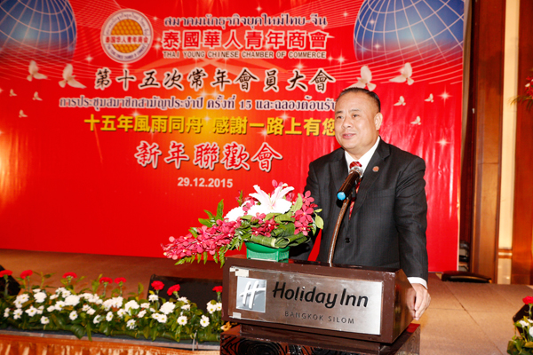 今年是泰中建交40周年,泰华各界接连举办庆祝活动,深化泰中两国友谊,中国“一带一路”大战略的实施、东盟共同体的建立,泰国和泰国的企业、企业家们迎来了空前的大好发展机遇。泰国也将迎来新的、稳定的、长远的发展时代。青商会的各位兄弟姐妹,我们身处泰国的良好发展时代,背靠不断强盛的祖国,虽然我们大家来自各行各业,但是大家有共同的命运,共同的梦想,共同的动力,都流着中华民族的血液,让我们齐心协力,互帮互助,资源共享,协同发展,共创辉煌!青商会这个平台,也会为大家争取更多、更好的支持和资源,为大家的发展助力,力求把福利切实惠及到我们的每一位会员。我们青商会的会员们也要不断发展壮大自己的企业,只有自己站稳脚跟,才能更好的为泰华社会服务,为泰中两国的经济等各方面的交流与发展做出贡献。最后,祝大家新年快乐,身体健康,家庭幸福,事业蒸蒸日上!
