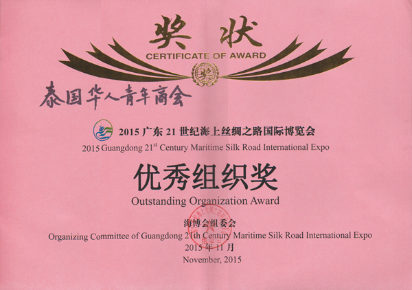 经过组委会公平、公开、公正、科学、客观的评审,泰国华人青年商会荣获2015海博会“优秀组织奖”,并由组委会颁发奖状。