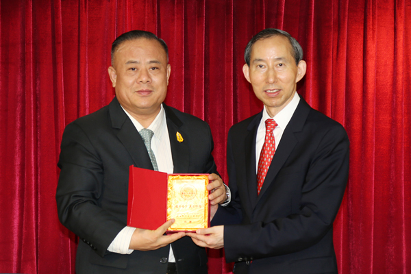 龙宇翔主席对泰国华人青年商会的热情接待表示感谢,他说,李桂雄会长在中泰两国享誉盛名,在泰华社团具有举足轻重的地位,是我的好兄弟、好朋友。他领导推动的泰国华人青年商会多年以来为中泰两国的经济、文化、科技的合作与交流,中华民族传统文化的弘扬与继承做了巨大的贡献,为祖国争得了荣誉。我作为商会的一员,要做好服务,为祖国、为商会、也为艺术家们。所以,我们代表团此次访泰的第一站就设在泰国华人青年商会,代表团人数为109人,“1”是起步,“9”是长久,象征着中泰的友谊长长久久。泰国的华人华侨在全球华人华侨中人数最多,影响最大,为中泰两国的友好交往奠定了基础。泰国是佛教国家,人民质朴善良,社会包容度强,是一块投资旅游的“福”地。这次来访,我们的艺术家为商会送上一幅“福”字书法纪念品,祝愿各位同仁幸福富足、身体康健,祝愿商会会务蒸蒸日上,兴隆发达。