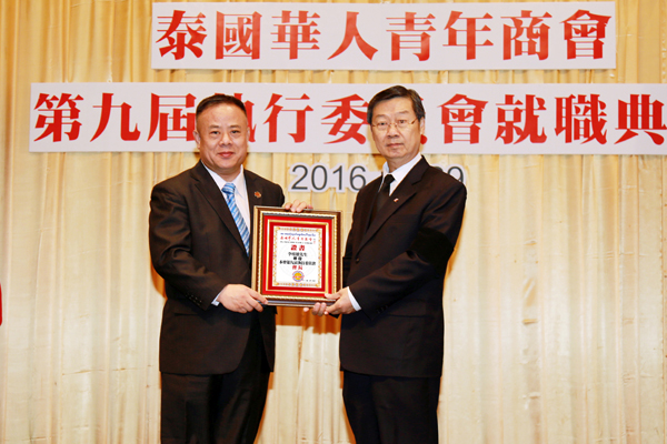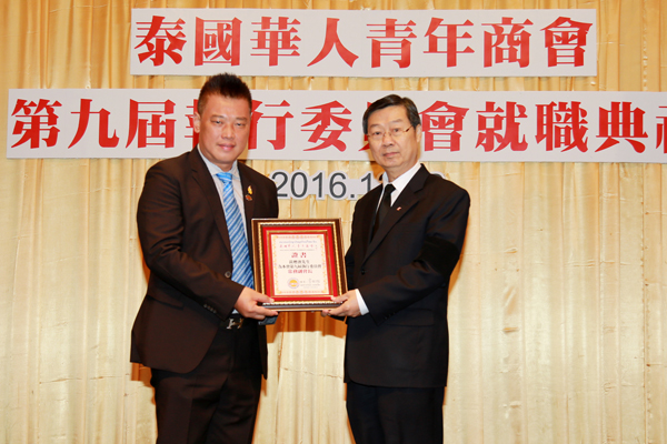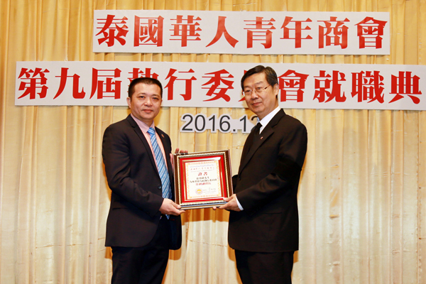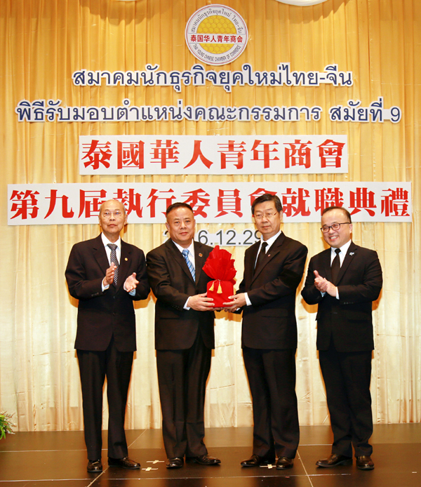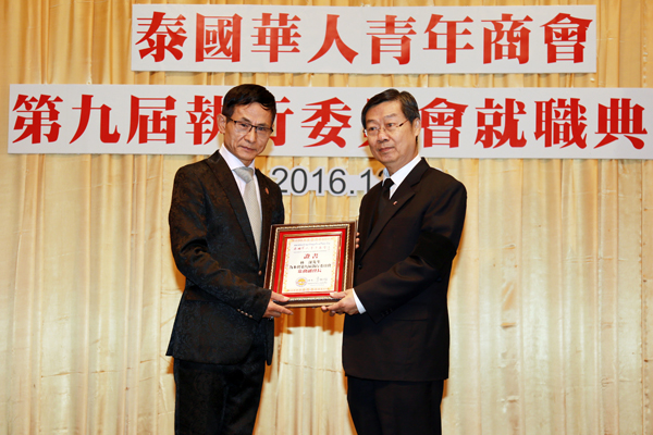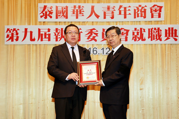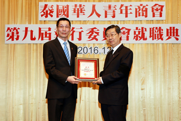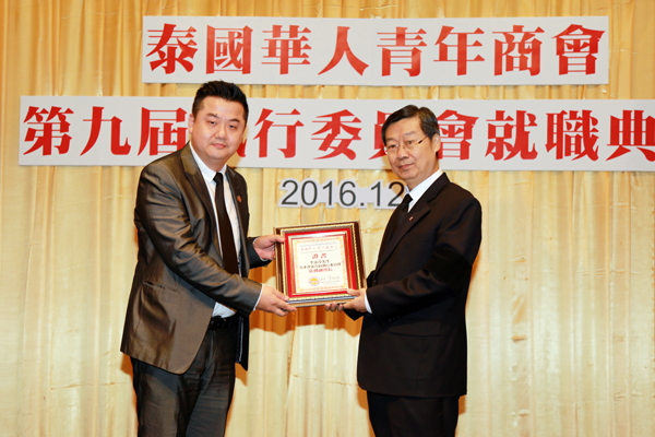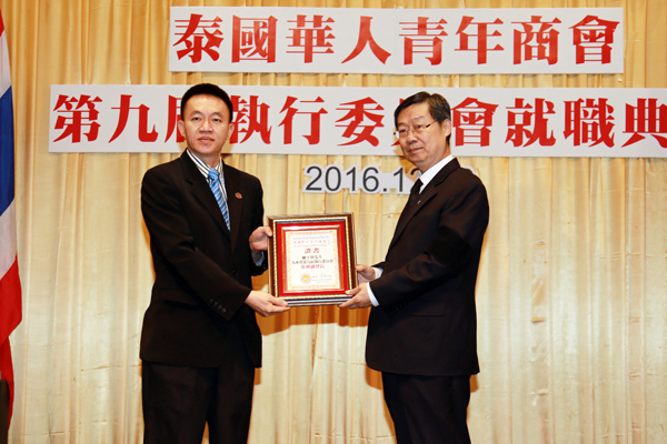 2016年12月29日,泰国华人青年商会第九届执行委员会就职典礼假曼谷中华总商会光华堂隆重举行,泰国国家立法议会第一副议长素拉猜‧良汶洛猜阁下、中华人民共和国驻泰王国大使馆临时代办吴志武阁下、泰国中华总商会陈振治主席共同主持就职典礼仪式,中华人民共和国驻泰王国大使馆参赞兼总领事李春林、侨务参赞张东浩、泰国中华总商会副主席林楚钦先生等领导、嘉宾出席典礼仪式。