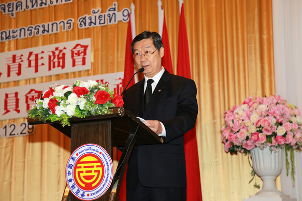 我很高兴出席泰国华人青年商会第九届执委会就职典礼,请允许我代表在北京的宁赋魁大使和中国驻泰国大使馆向泰国华人青年商会各位常执委和蝉联会长的李桂雄先生表示热烈的祝贺!