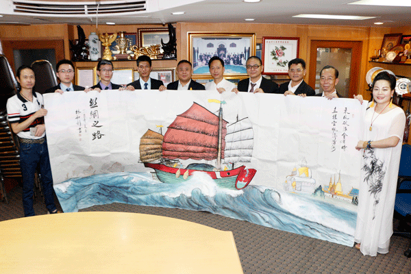 李锐忠对李桂雄会长和青商会的热情接待表示感谢,他说,李桂雄会长是一位杰出的爱国侨领,引领青商会同仁为中泰两国的友好往来、经贸合作与文化交流做了很多工作,感谢李桂雄会长长期以来对泰中文化艺术交流活动的大力支持。李锐忠介绍说,《潮起五洲》书画院的宗旨是“亲情跨越国界,乡音沟通世界”,我们要通过文化艺术作品把中国的优秀传统文化展示给海外的华侨华人,在“一带一路”的大背景下,讲好中国故事与家乡的故事,为泰中两国及家乡的友好交流与合作添砖加瓦。