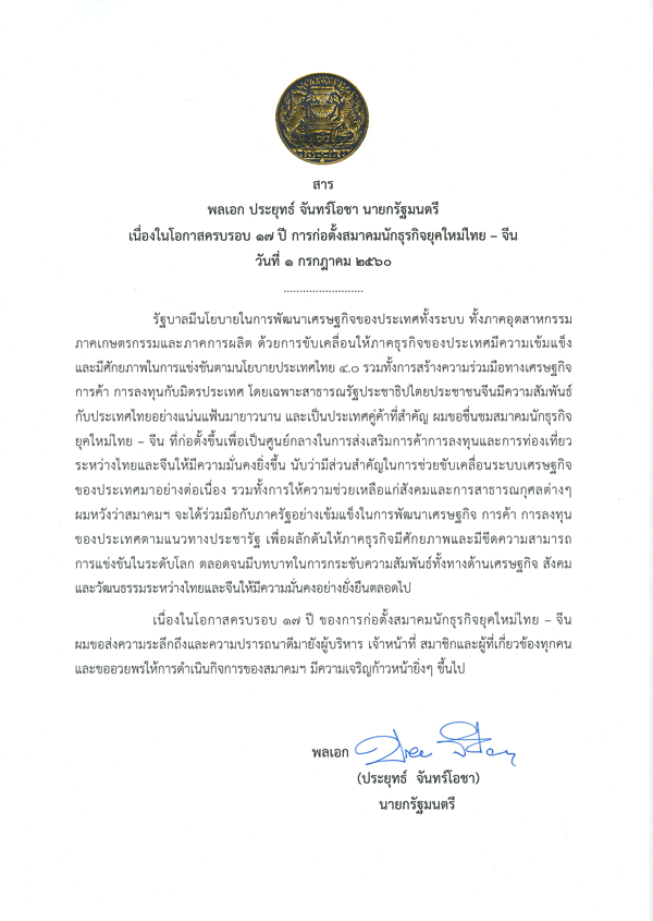 สมาคมนักธุรกิจยุคใหม่ไทย-จีน ก่อตั้งขึ้นวันที่ 1 กรกฏาคม 2543 เนื่องในโอกาสครบรอบ 17 ปี ฯพณฯ พลเอก ประยุทธ์ จันทร์โอชา นายกรัฐมนตรี ได้มีสารแสดงความยินดีให้กับนายบุญยงค์ ยงเจริญรัฐ นายกสมาคมนักธุรกิจยุคใหม่ไทย-จีน และคณะกรรมการฯ