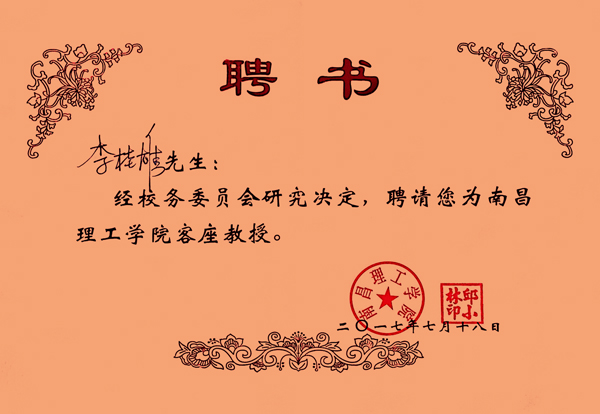 邱小林校长表示,李会长不仅是中泰的友好使者、社会活动家、著名青年企业家和侨领,也是国际性的青年领军人物,具有先进的理念和广泛的知识。经校务委员会研究决定,兹特别聘请李桂雄会长为南昌理工学院的客座教授,并给李桂雄会长颁送聘书。盛情邀请李会长再次到南昌理工学院,给学生们授课。