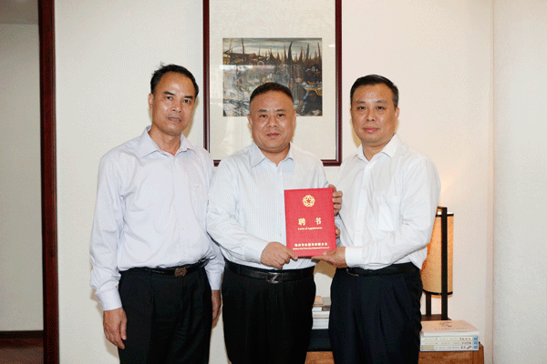 梅州市侨联汤志平主席(右)、张映虹副主席(左)敦请李桂雄会长(中)任梅州市侨联名誉主席,并颁送聘书