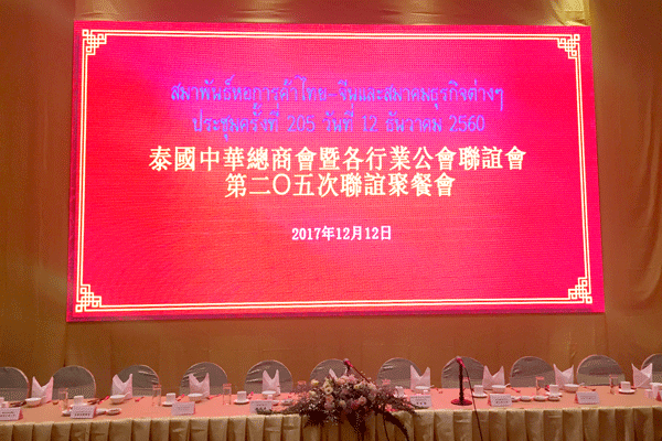 泰国中华总商会暨各行业公会第205次聚餐联谊会,于2017年12月12日中午11时30分,在曼谷沙吞路泰国中华总商会大厦9楼光华堂举行,由泰国中华总商会、泰国商联合总会、泰国米业公会、泰国皮业公会、泰国江浙沪总商会等值月作东,联谊会副主席兼执行主任林楚钦致开会词并主持会议,各行业公会的首长、代表、媒体100多人出席,场面亲切和谐。