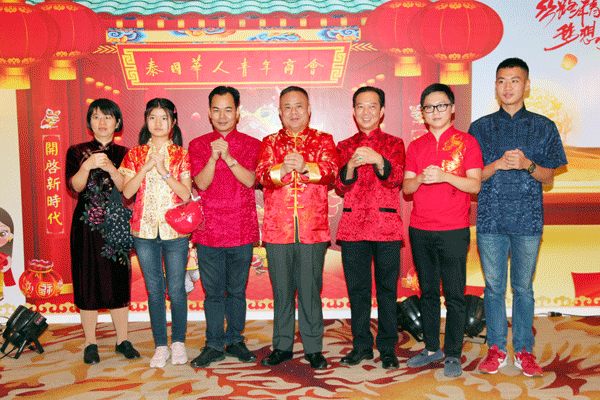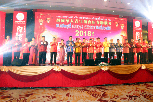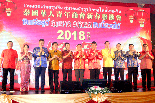 新时代·新征程——泰国华人青年商会2018年新春联欢会,于2018年2月12日晚,假曼谷泰国中华总商会光华堂隆重举行。曼谷市市长阿沙温·权曼警上将、中国驻泰王国大使馆李春林参赞兼总领事、泰国中华总商会暨各行业公会联谊会林楚钦执行主任、泰国最高法院前副院长黄其国大法官、叻塔蓬警中将、比益警少将,中国驻泰王国大使馆领事部副主任陈朝阳、二秘兼领事周广旭、随员李昕朔,名誉会长林栩、林嘉南、林伟、吴楚潮、李荣、李宇明、毛七一、方舫,顾问蔡伟才、冯文亮、白俊昆、周林省、黄楚斌、蔡孝兴、王文彬、刘忠秋、康丹、汪士崴、林广锋、叶沐强、林俊然、余佳丽,嘉宾赵阳、吕劲松、吴琮业、陈小扬、杨晓彬、徐翔等领导、嘉宾莅临出席盛会,共庆新春佳节。