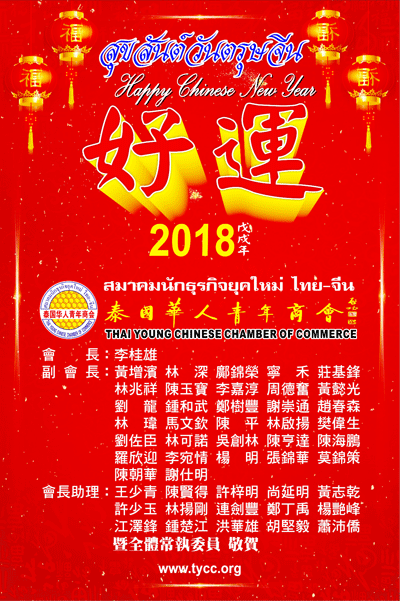 值此中国农历新年到来之际,我衷心祝愿各位领导、嘉宾、商会同仁们身体健康、家庭幸福、生意兴隆、好运连连、万事如意!最重要的是,祝贺泰国华人青年商会会务兴隆、蒸蒸日上,泰中友谊万古长青!谢谢大家!