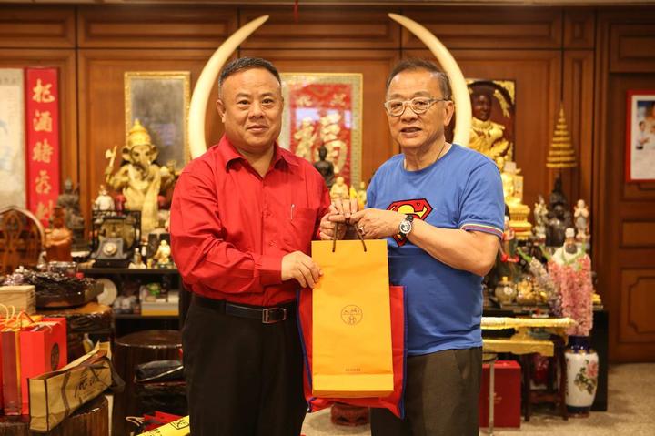 为庆祝泰国中国和平统一促进总会王志民会长辖下嘉乐斯集团成立17周年,暨王志民会长与夫人王林怡株女士49周年结婚纪念日,泰国华人青年商会会长,泰国中国和平统一促进总会副会长兼秘书长李桂雄,于2018年4月21日专程到曼谷嘉乐斯大厦办公室向王志民会长表示祝贺!