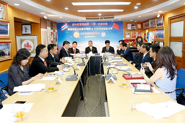 泰国前文化部、教育部、科技部部长沃拉瓦·鄂阿平亚军阁下在座谈中表示,泰国华人众多,但目前还没有一个进行两国语言、风俗文化、最新知识传授的专业化教育基地,非常感谢中国习近平主席提出的“一带一路”倡议,为泰中两国跨境合作办学提供了契机。中国华南师范大学来泰建立附属学校这一项目极具可行性,泰国政府及我本人都非常乐意为之提供协助,帮助华南师范大学泰国附属学校尽快落地。他强调,泰中两国关系密切,是“一家人 ”,中国是亚洲最强大、发展最快的国家,泰国是东盟地区的中心,我相信泰中两国的强强联合,华南师范大学泰国附属学校的建立,将为两国的医药、饮食、教育、科技、经贸等领域的融合发展作出贡献。今天泰国环球文化教育集团与中国华南师范大学《合作备忘录》的签署就是一个美好的开端。祝泰中两国友谊常青,祝华南师范大学泰国附属学校早日建立。