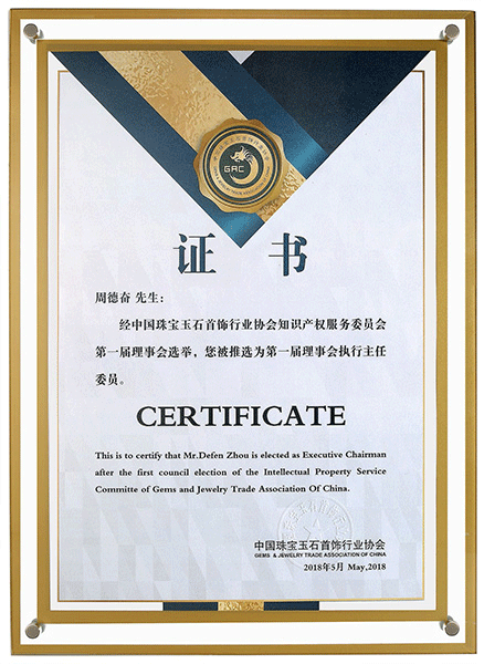 粤豪始终尊重并保护原创设计,与中宝协知识产权服务委员会的成立宗旨不谋而合,也得到了行业及社会的认可与肯定。这种专注研创、精益求精的精神,也是周德奋先生不断获得行业及国内国际机构认可的原因所在。就在不久前,周德奋先生被中国国家标准化管理委员会聘为全国首饰标准化技术委员会(SAC/TC256)委员。