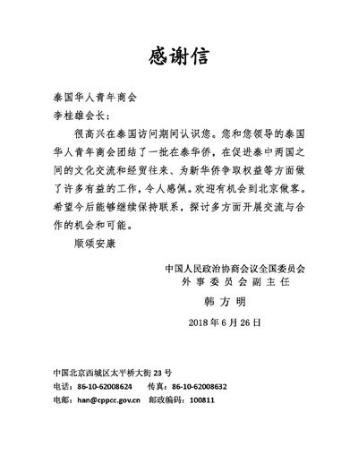 中国人民政治协商会议全国委员会外事委员会副主任韩方明,于2018年6月26日向泰国华人青年商会李桂雄会长致感谢函,肯定并感谢泰国华人青年商会在泰中两国友好往来及团结、服务新侨等方面做出的积极贡献。并期待进一步加强交流与合作,共同为泰中两国的友好事业添砖加瓦。