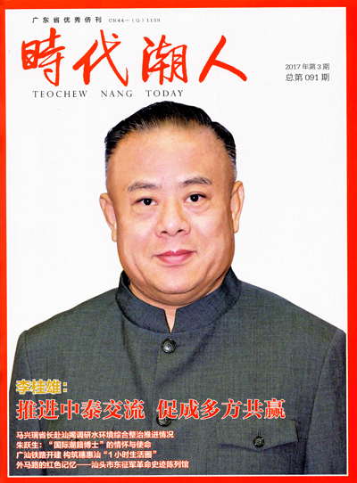 李桂雄:记得最清楚的是2005 年中泰建交30 周年之际,我作为第一个与央视合作的泰国华侨,投资成立了泰国中文电视台并出任董事长,从生意场走进了文化经营领域,这个转向对我而言很有意义。目前投资最多的城市是深圳。其中泰国环球集团旗下的泰国馆,作为泰国食品出口最大最全的公司之一,目前在深圳、上海、成都等地方都开馆了,广州的泰国馆在筹备当中,对增进泰中经贸合作有实际推动作用。家乡潮阳也是我投资的重点。在汕头已经投资了5 年房地产,现在参与了汕头华侨试验区和练江基地的投资建设。练江是潮阳人的母亲河,练江基地是潮阳区扩容提质的新战场,这个项目面朝练江出海口。希望可以帮助家乡早日发展起来,我也将会尽自己所能,引导更多的华人华侨回乡投资,共同参与家乡建设。
