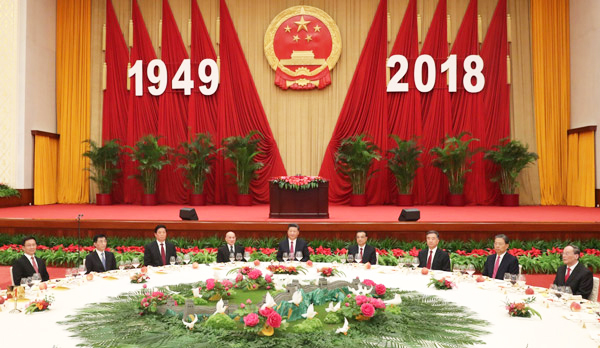 9月30日晚,国务院在人民大会堂举行国庆招待会,热烈庆祝中华人民共和国成立六十九周年。习近平、李克强、栗战书、汪洋、王沪宁、赵乐际、韩正、王岐山等党和国家领导人与1200多位中外人士欢聚一堂,同庆共和国华诞。中共中央政治局常委、国务院副总理韩正主持招待会。柬埔寨国王西哈莫尼应邀出席招待会。出席招待会的还有:在京中共中央政治局委员、中央书记处书记、全国人大常委会副委员长、国务院副总理、国务委员、国家监察委员会主任、最高人民法院院长、最高人民检察院检察长、全国政协副主席和从领导职务上退下来的同志,以及中央军委委员、曾担任中央军委委员的同志等。
