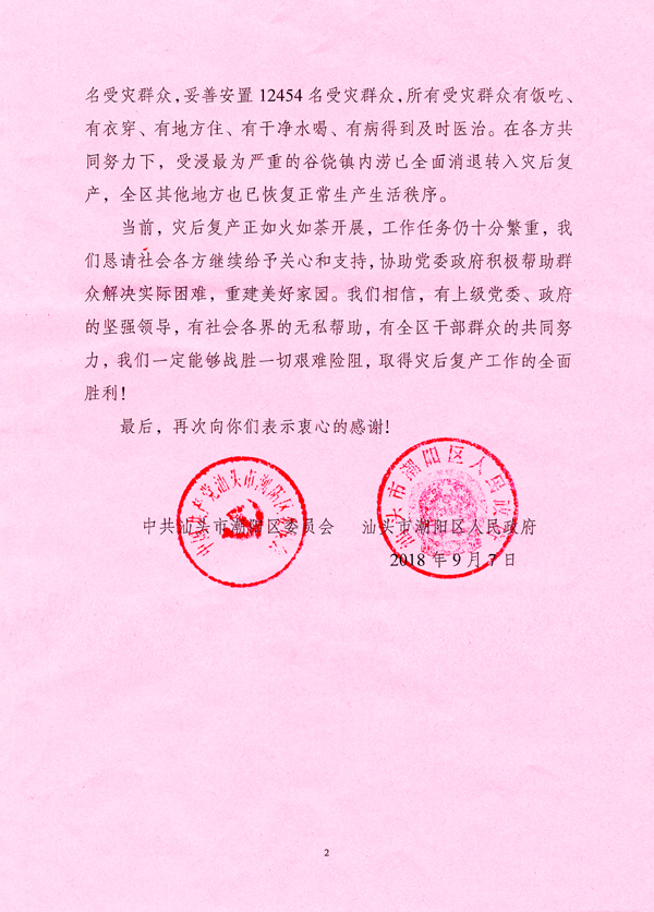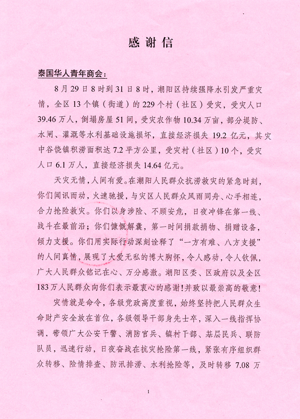 潮阳区、潮南区感谢泰国华人青年商会捐款救济8‧30水灾