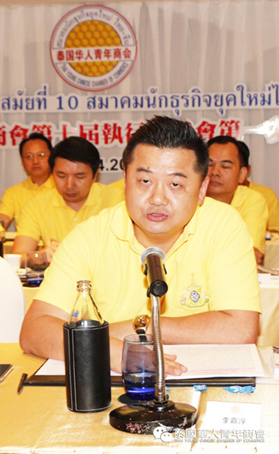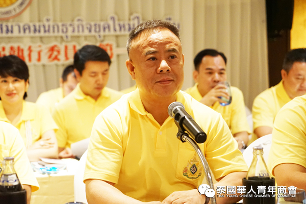 李桂雄会长在致辞中说,今天是泰国华人青年商会第十届第一次执委会,首先感谢各位安排宝贵时间出席今天的会议。5月4日,即将迎来普天同庆的大喜日子,崇颂泰国十世皇登基加冕大典,我们泰国华人青年商会全体同仁,感恩皇上恩德,为表达我们对皇帝皇室的崇敬和忠诚,共同参与欢庆登基大典的大喜庆活动。敬请我们商会同仁和家人,在此期间穿戴黄色服饰,以表示我们的最高敬意。