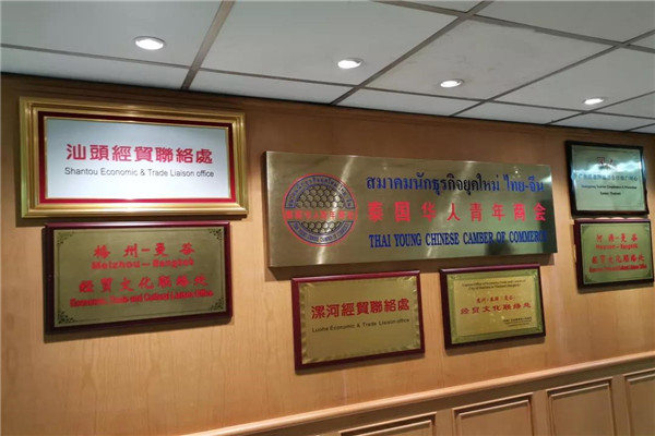 来到曼谷是隆路ITF大厦31楼,除了泰国华人青年商会的大招牌,同时映入眼帘的,还有大招牌四周环绕的牌匾,诸如汕头经贸联络处、漯河经贸联络处、梅州—曼谷经贸文化联络处,以及广东驻泰国旅游合作推广中等,更醒目的还有泰中文化产业集团和泰国新华杂志出版社两块招牌。