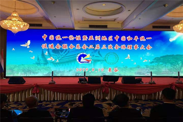由亚洲地区和平统一促进总会主办,大会主席王志民,大会执行主席吴炳林,大会秘书长李桂雄主持的“中国统一论坛”于今天(2019年8月10日)在泰国曼谷隆重举办,广大海内外中华儿女高度关心、支持祖国的和平统一事业,坚决打击、遏制任何形势的“台独”、“港独”分裂活动,加快推进祖国和平统一进程,维护国家领土、主权完整,维护香港“一国两制”政策,共同致力于中华民族的伟大复兴!