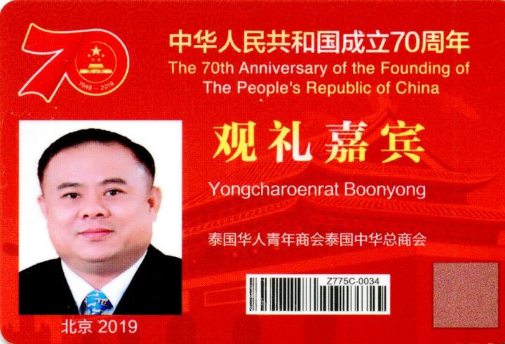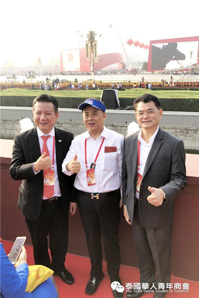 泰国华人青年商会会长李桂雄,执行会长陈亨利、李嘉淳,常务副会长邝锦荣、陈玉宝,副会长谢崇通、赵春森、虎炎等应邀参加庆祝中华人民共和国成立70周年大会,并现场观看了盛大的阅兵式和群众游行。共同见证新中国成立70年来的波澜壮阔,祝福祖国繁荣昌盛。