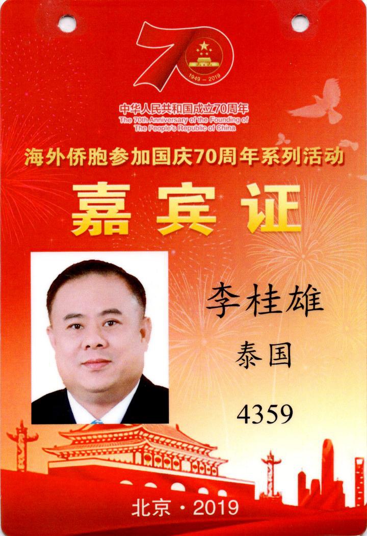 李桂雄表示,今天我站在天安门西侧观礼台阅兵现场,无比的兴奋与激动!今天的大阅兵,让我感受深刻,让我看到祖国真正的强盛,展现了中国国际地位和综合国力的显著提高,军事建设取得的辉煌成就。我爱我的祖国,我爱我的故乡,新中国成立70周年,中国特色社会主义思想引领世界,“一带一路”惠及全球,我们作为中华儿女,感到万分的骄傲和自豪。团结就是力量,中华民族实现伟大复兴的光明前景近在眼前!我衷心祝福我的祖国更加繁荣进步,人民安居乐业、父老乡亲健康幸福!