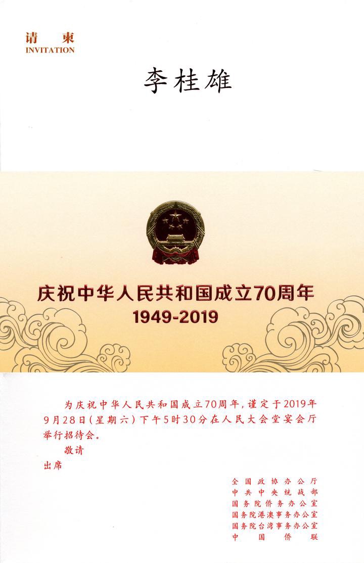 9月30日晚,庆祝中华人民共和国成立70周年招待会在人民大会堂隆重举行。中共中央总书记、国家主席、中央军委主席习近平出席招待会并发表重要讲话,李桂雄会长、赵春森副会长应邀出席。10月1日上午,李桂雄会长等参加在北京天安门广场举行的庆祝中华人民共和国成立70周年大会。