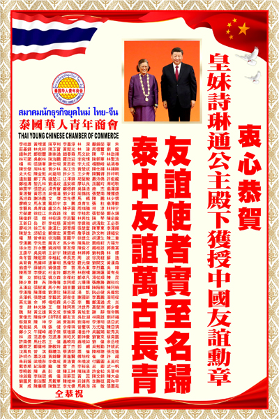 9月29日上午,中华人民共和国国家勋章和国家荣誉称号颁授仪式在人民大会堂隆重举行,泰王国皇妹诗琳通公主殿下因长期以来对泰中关系做出的杰出贡献而获授“友谊勋章”,中国国家主席习近平向泰国公主诗琳通颁授“友谊勋章”。泰国华人青年商会全体同仁恭贺皇妹诗琳通公主殿下获授“友谊勋章”,愿泰中友谊万古长青。