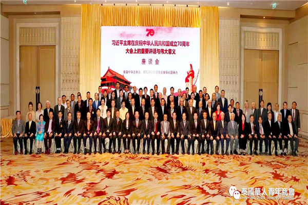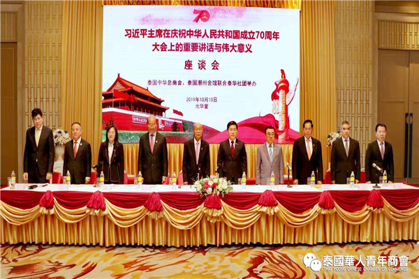 泰国中华总商会、泰国潮州会馆联合泰华社会,于 2019 年 10 月 10 日下午,假泰国中华总商会光华堂举行“习近平主席在庆祝中华人民共和国成立 70 周年大会上的重要讲话与伟大意义座谈会”。中华人民共和驻泰王国特命全权大使吕健阁下、泰国中华总商会陈振治主席、泰国潮州会馆黄迨光主席等侨团领导、代表出席。