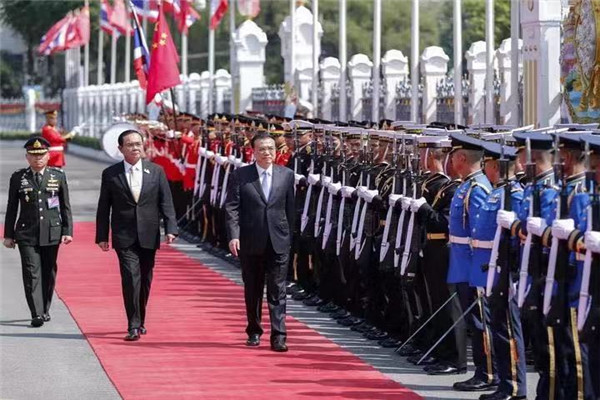 应泰国总理巴育邀请,中国国务院总理李克强率团出席东南亚合作领导人系列会议,并正式访问泰国。期间,李克强总理在泰国曼谷出席了第22次中国-东盟(10+1)领导人会议,第三次区域全面经济伙伴关系协定(RCEP)领导人会议等系列活动,5日上午,泰国总理巴育在总理府前广场为李克强总理举行隆重仪式,欢迎中国总理正式访问泰国。两国总理登上检阅台,军乐队高奏中泰两国国歌。李克强在巴育陪同下检阅了仪仗队。