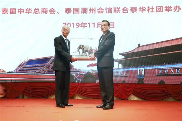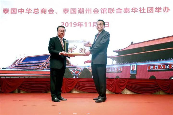 今天是总理阁下第二次莅临此地,亲切慰问泰华各界,带来了中国政府对我们的关心和鼓励,同时也带来了中国人民的深情厚谊。上一次,阁下莅访是在2013年,六年时光匆匆过去,中国在科技、国防、生态、基建等众多领域都取得骄人的成绩,尤其是科技方面,“上九天揽月,下五洋捉鳖”,令人震撼。希望借助习近平主席“一带一路”的东风,中泰双方实现政策沟通、设施联通、贸易畅通、资金融通、民心相通、更进一步扩大领域、高水平、深层次的交流合作,携手共进,成就两国共同繁荣的愿景。