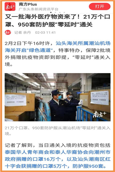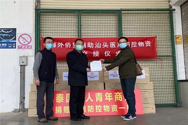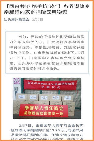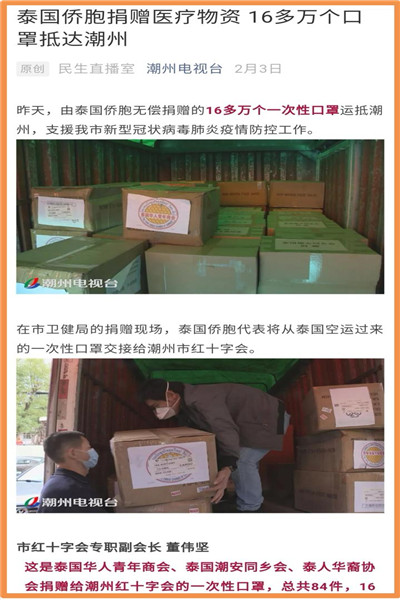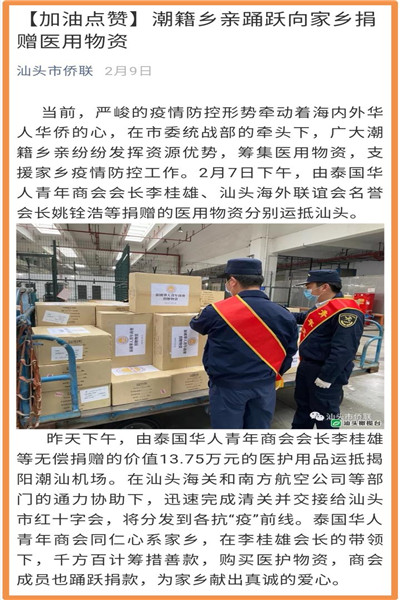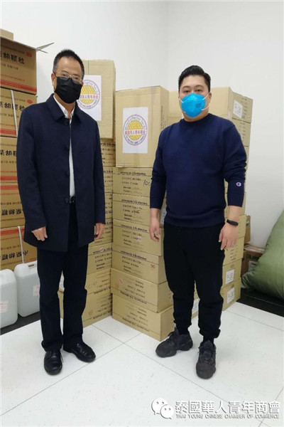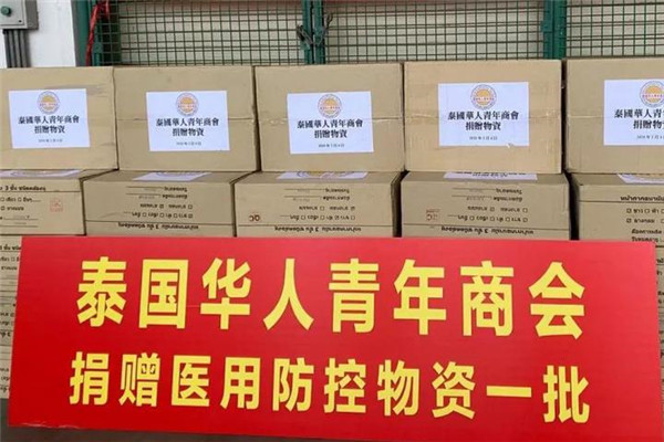 泰国华人青年商会会长李桂雄、执行会长李嘉淳等商会领导十分重视、担忧祖国疫情,得讯祖国多地急缺口罩、防护服等医疗物资,第一时间召开紧急会议,号召商会会员行动起来,以捐助款项、购买医疗防护物资等各种方式,支援祖国和家乡的抗疫工作,获得众多会员的积极响应,大家踊跃捐赠善款、口罩、防护服等医疗物资,及时送往祖国。为了防止泰国疫情扩散导致市场医疗物资紧缺,泰国政府宣布对口罩等医疗用品实行管控。因此,医疗用品的采购和运送变得十分困难,通过大家不懈努力,多方寻找、四处奔波,千方百计将一批批医疗物资,通过南方航空、国际快递等各种方式发往国内。