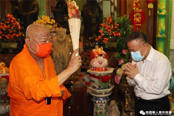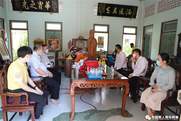 上午10时,李桂雄会长一行首先抵达泰京敕賜普门报恩寺,很高兴的拜见了御封华宗大尊长仁德上师,仁德上师表示,感恩行善是中华民族的传统美德,李桂雄会长带领泰国华人青年商会及旅泰新侨民在泰辛勤创业,取得了良好的成绩,大家都很认可,感谢李会长你们在疫情的非常时期来报恩寺看望我们,拜佛祈福,此次疫情凸显了海内外中华儿女团结相助的伟大精神,令世界信服。近几个月来,祖国和泰国新冠疫情牵动着大家的心,广大信众积极践行佛教慈悲济世的精神,遵循因果规律,行善积德,佛教在泰中两国乃至全球的抗疫工作中发挥了重要的作用。仁德上师向大家赠送了经书,他说,目前报恩寺虽然暂停了宗教活动,但寺内僧人却时刻不忘饱受疫情折磨的手足同胞,日日以虔诚恳切之心诵经念佛,祈愿灾难疫情尽快消除,以佛教特有的方式为解救众生苦难奉献力量。