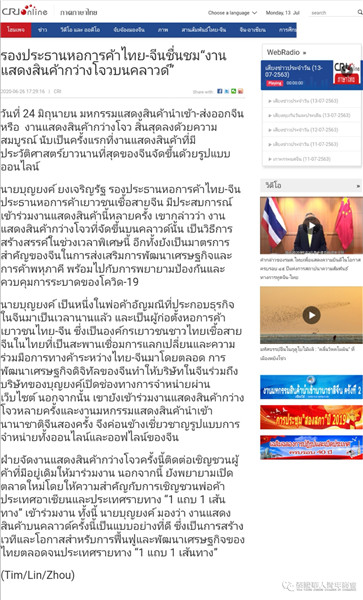 วันที่ 24 มิถุนายน มหกรรมแสดงสินค้านำเข้า-ส่งออกจีน หรือ งานแสดงสินค้ากว่างโจว สิ้นสุดลงด้วยความสมบูรณ์ นับเป็นครั้งแรกที่งานแสดงสินค้าที่มีประวัติศาสตร์ยาวนานที่สุดของจีนจัดขึ้นด้วยรูปแบบออนไลน์ นายบุญยงค์ ยงเจริญรัฐ รองประธานหอการค้าไทย-จีน ประธานหอการค้าเยาวชนเชื้อสายจีน มีประสบการณ์เข้าร่วมงานแสดงสินค้านี้หลายครั้ง เขากล่าวว่า งานแสดงสินค้ากว่างโจวที่จัดขึ้นบนคลาวด์นั้น เป็นวิธีการสร้างสรรค์ในช่วงเวลาพิเศษนี้ อีกทั้งยังเป็นมาตรการสำคัญของจีนในการส่งเสริมการพัฒนาเศรษฐกิจและการค้าพหุภาคี พร้อมไปกับการพยายามป้องกันและควบคุมการระบาดของโควิด-19 นายบุญยงค์ เป็นหนึ่งในพ่อค้าอัญมณีที่ประกอบธุรกิจในจีนมาเป็นเวลานานแล้ว และเป็นผู้ก่อตั้งหอการค้าเยาวชนไทย-จีน ซึ่งเป็นองค์กรเยาวชนชาวไทยเชื้อสายจีนในไทยที่เป็นสะพานเชื่อมการแลกเปลี่ยนและความร่วมมือการทางค้าระหว่างไทย-จีนมาโดยตลอด การพัฒนาเศรษฐกิจดิจิทัลของจีนทำให้บริษัทในจีนร่วมถึงบริษัทของบุญยงค์เปิดช่องทางการจำหน่ายผ่านเว็บไซต์ นอกจากนั้น เขายังเข้าร่วมงานแสดงสินค้ากว่างโจวหลายครั้งและงานมหกรรมแสดงสินค้านำเข้านานาชาติจีนสองครั้ง จึงค่อนข้างเชี่ยวชาญรูปแบบการจำหน่ายทั้งออนไลน์และออฟไลน์ของจีน ฝ่ายจัดงานแสดงสินค้ากว่างโจวครั้งนี้ติดต่อเชิญชวนผู้ค้าที่มีอยู่เดิมให้มาร่วมงาน นอกจากนี้ ยังพยายามเปิดตลาดใหม่โดยให้ความสำคัญกับการเชิญชวนพ่อค้าประเทศอาเซียนและประเทศรายทาง “1 แถบ 1 เส้นทาง” เข้าร่วมงาน ทั้งนี้ นายบุญยงค์ มองว่า งานแสดงสินค้าบนคลาวด์ครั้งนี้เป็นแบบอย่างที่ดี ซึ่งเป็นการสร้างเวทีและโอกาสสำหรับการฟื้นฟูและพัฒนาเศรษฐกิจของไทยตลอดจนประเทศรายทาง “1 แถบ 1 เส้นทาง” (Tim/Lin/Zhou) 。