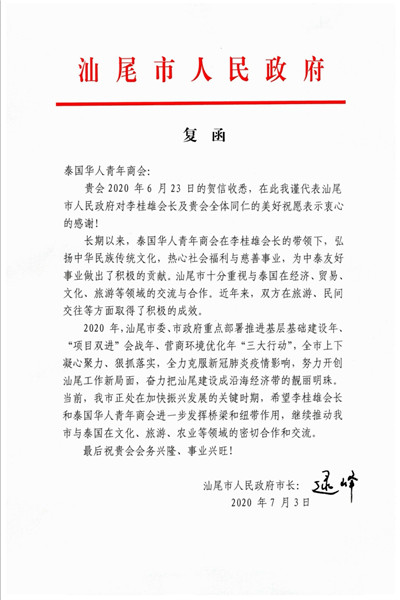 汕尾市政府向泰国华人青年商会复函