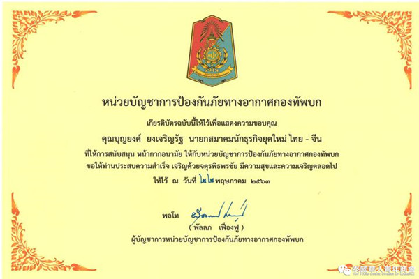 พลโท ธัญญา เกียรติสาร แม่ทัพภาคที่ 2 แสดงความยินดีกับการก่อตั้งสมาคมฯ ครบรอบ 20 ปี โดยกล่าวว่าประเทศไทยและจีนมีการเจริญความสัมพันธ์มายาวนาน การที่ประเทศไทยประสบความสำเร็จในการควบคุมโควิดแยกไม่ออกจากการสนับสนุนขององค์กรไทยเชื้อสายจีน, นักธุรกิจไทยเชื้อสายจีน และชาวจีนโพ้นทะเล ต้องขอขอบคุณคุณบุญยงค์ ยงเจริญรัฐ ที่นำพานักธุรกิจของสมาคมฯ ส่งเสริมการพัฒนาเศรษฐกิจของประเทศไทย สร้างคุณูปการต่อกิจการสาธารณกุศลมาเป็นเวลายาวนาน เมื่อเดือนตุลาคมปีที่แล้ว เกิดอุทกภัยที่ภาคตะวันออกเฉียงเหนือของไทย คุณบุญยงค์ ยงเจริญรัฐ นายกสมาคมฯ พร้อมด้วยนายประสาน หวังรัตนปราณี ผู้ช่วยรัฐมนตรีประจำสำนักนายกรัฐมนตรีไปเยี่ยมประชาชนผู้ประสบภัย และในนามของหอการค้าไทย-จีน ได้มอบอาหารและปัจจัยดำรงชีพแก่ประชาชนซึ่งเป็นการสร้างขวัญและกำลังใจแก่ประชาชน ขณะนี้สถานการณ์โควิดคลี่คลายลง มาตรการต่างๆ ก็ผ่อนคลาย อาจจะทำให้เผชิญกับความท้าทายใหม่ สมาคมฯ ได้มอบชุดอุปกรณ์ป้องกันโควิด ทำให้เราซาบซึ้งในน้ำใจของสมาคมฯ ในนามของแม่ทัพภาคที่ 2 ต้องขอขอบคุณสำหรับการมอบสิ่งดีๆในครั้งนี้ หวังเป็นอย่างยิ่งว่าคนไทยเชื้อสายจีน และชาวจีนโพ้นทะเล จะร่วมกันสร้างคุณูปการใหม่ในการกระชับความสัมพันธ์ไทย-จีน ส่งเสริมการขยายเศรษฐกิจการค้า, การแลกเปลี่ยนด้านวัฒนธรรม ถ้าสมาคมฯ ต้องการความช่วยเหลือหรือให้ช่วยประสานงานใดๆก็แจ้งมาได้ และขอให้สถานการณ์ไวรัสโควิดในไทยเข้าสู่สภาวะปกติ ฟื้นฟูการใช้ชีวิตของประชาชนและเศรษฐกิจของชาติโดยเร็ว