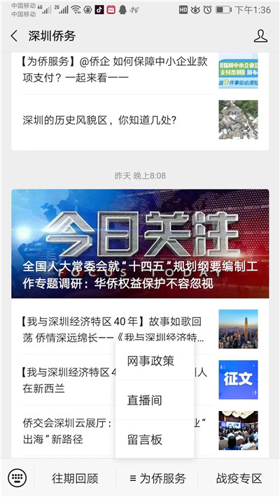 此次改版重点是微信公众号底部固定的三个按钮,全新设置了“往期回顾”、“为侨服务”、“战疫专区”三个栏目,并对应设计了许多集资讯、政策、服务、交流等功能为一体的二、三级子栏目。