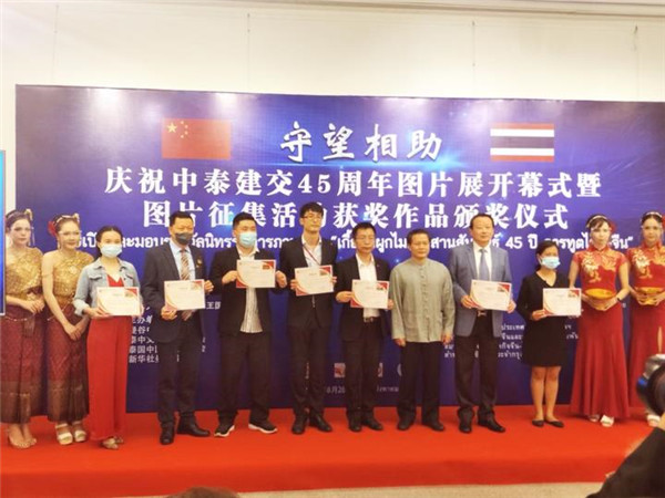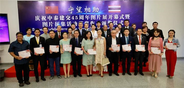 8月28日下午,曼谷中国文化中心举行了“守望相助--庆祝中泰建交45周年图片展开幕式暨图片征集活动获奖作品颁奖仪式”。中国驻泰国大使馆文化参赞常禹萌、泰中文化促进委员会副主席暨泰国工业部顾问团主席披塔·扎禄颂巴、北榄坡市副市长金达娜、曼谷中国文化中心暨驻曼谷旅游办事处主任顾洪兴、曼谷中国文化中心副主任张波、泰国中国企业总商会副会长赵阳、新华社曼谷分社社长明大军、泰国文化部代表威沙路、文化部宗教司秘书长素丽、泰国旅游局代表力查甘等嘉宾及获奖者参加了本次开幕及颁奖仪式。
